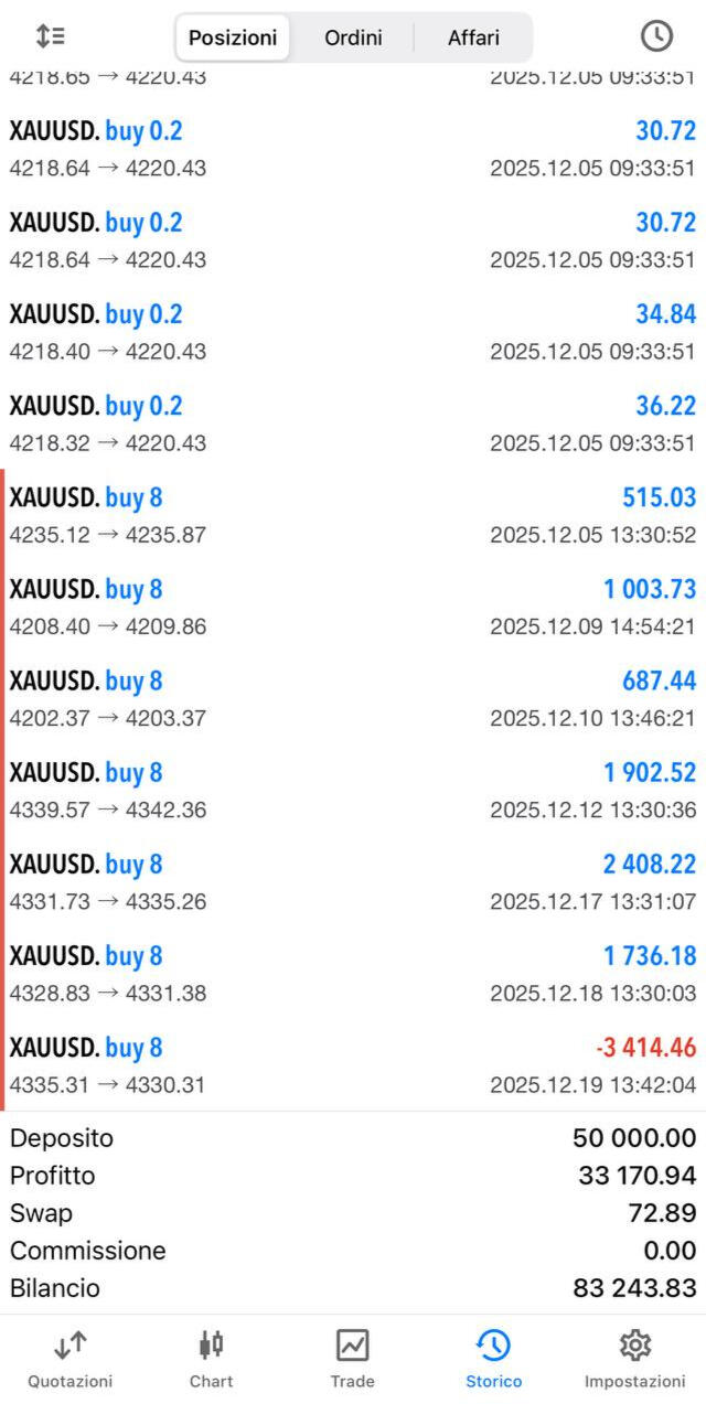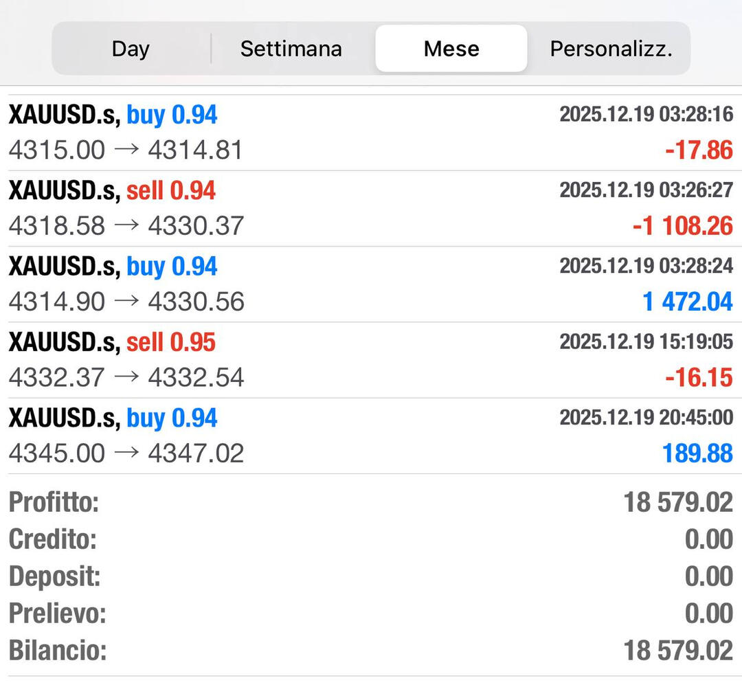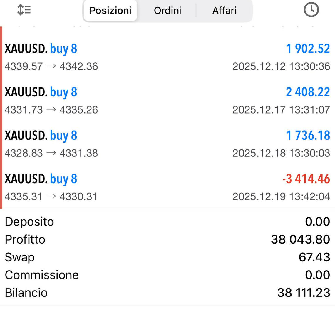 Sono un trader specializzato sul Gold (XAUUSD) e opero quotidianamente sui mercati con un approccio disciplinato e orientato alla gestione del rischio.Negli anni ho sviluppato strategie operative e sistemi automatici focalizzati su: